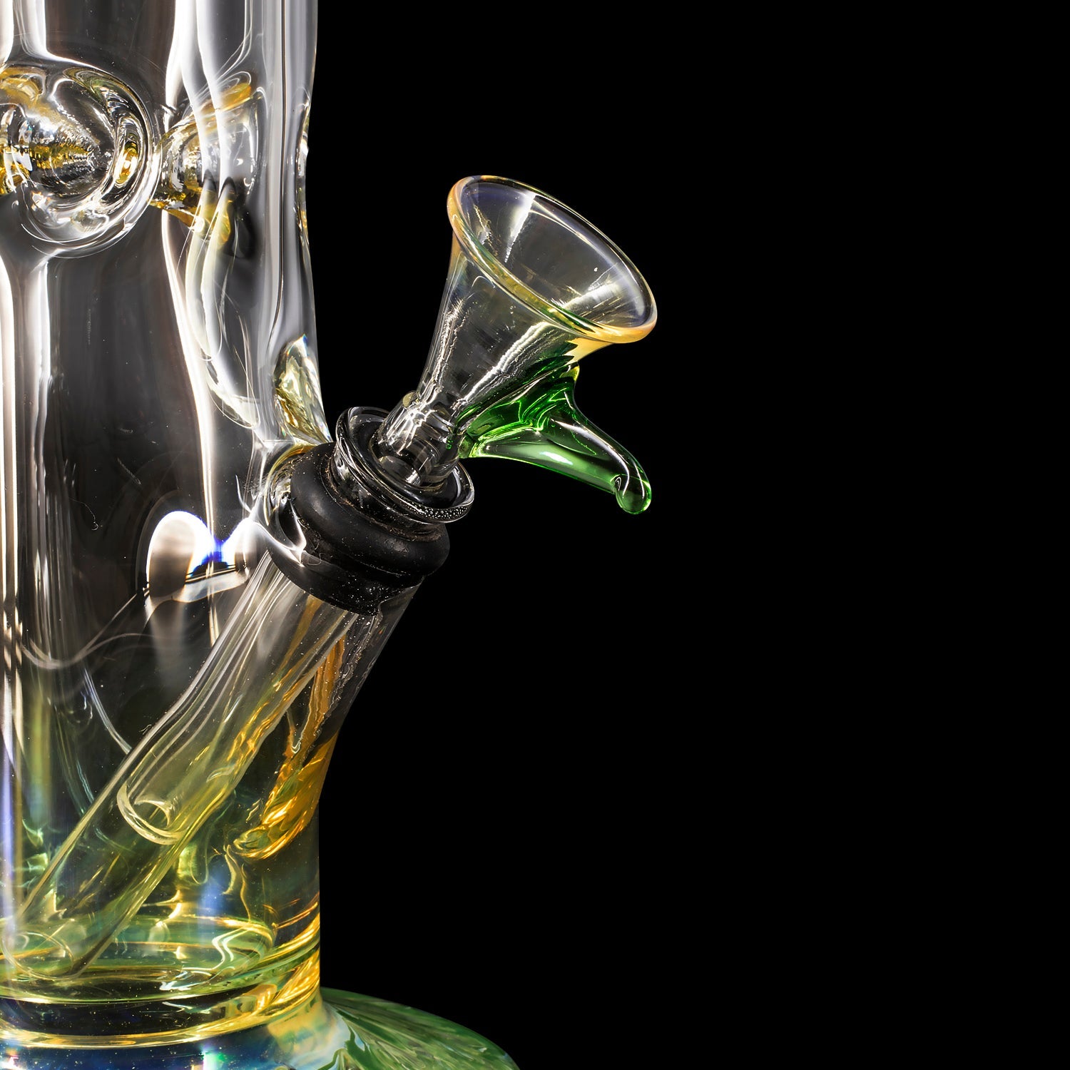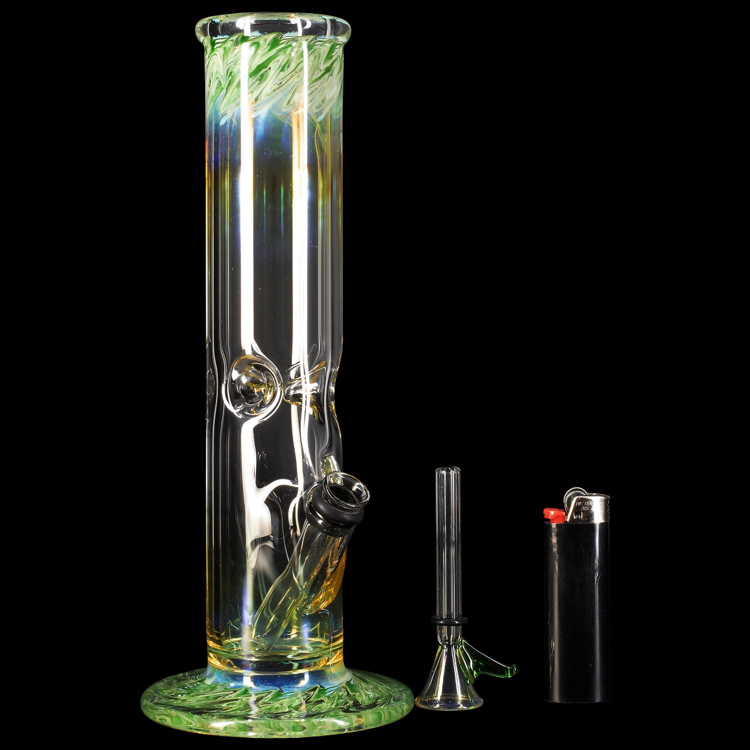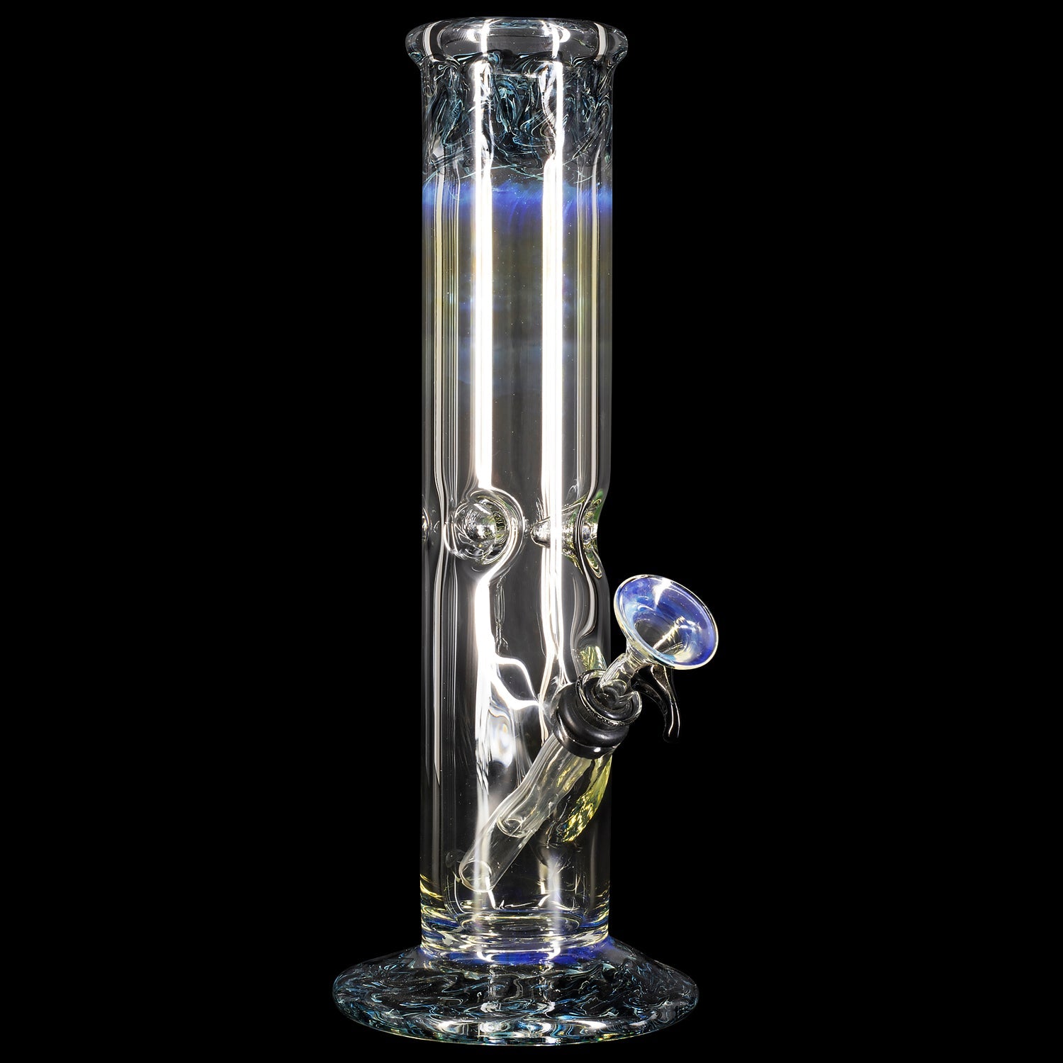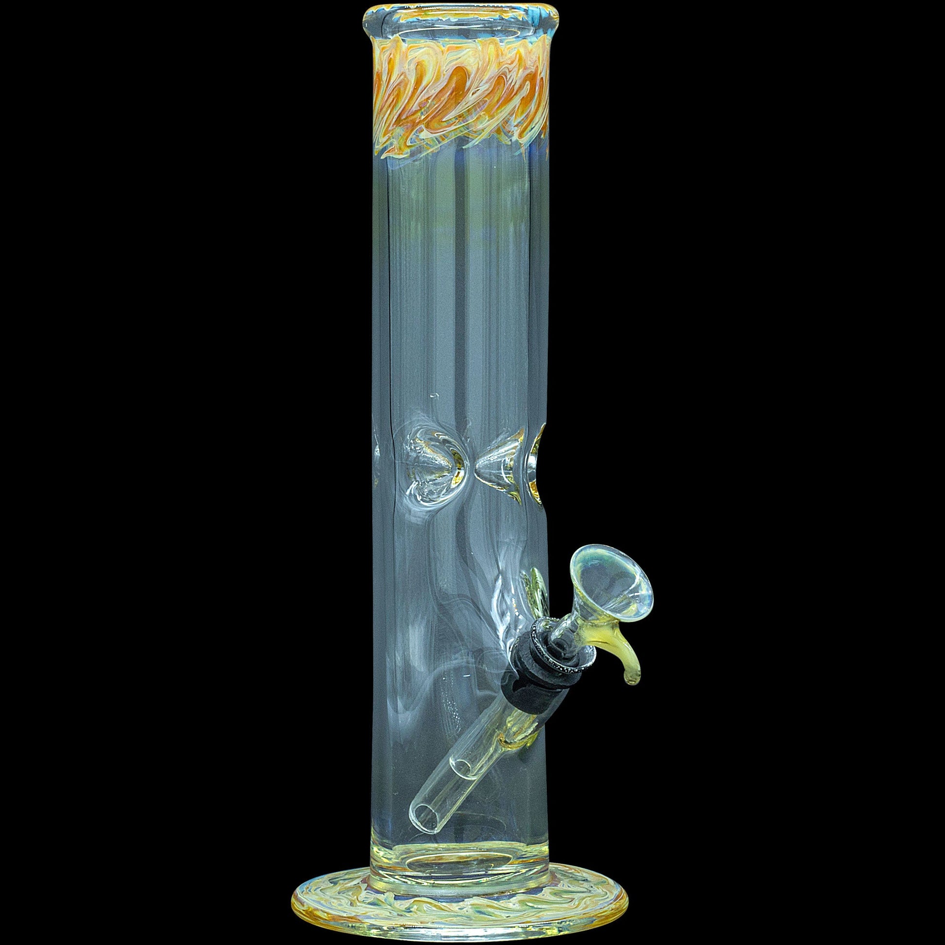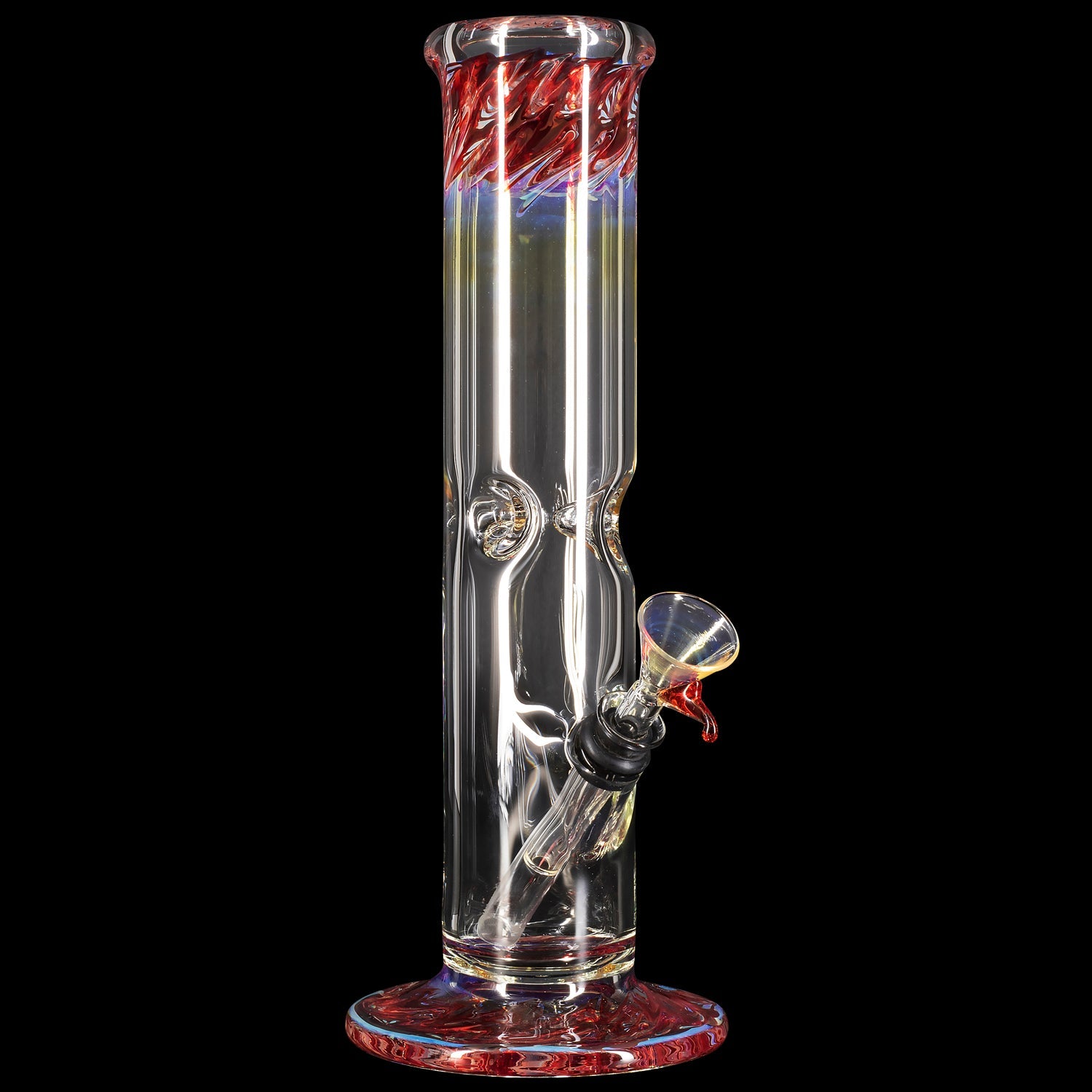 "The Chong-Bong" 10" tall classic straight bong with color and fume accents at the mouth and base. The 38mm diameter tube is just the right size opening for the perfect smoke density. Ice-pinch allows you to add ice to cool your smoke for a smooth hit. This bong features a pull-set bowl and stem design that that's classic and functional. Rubber grommets make for a air-tight seal when taking hits from the bong. The gathered and flared mouthpiece makes a for a nice feel around the mouth. A selection of beautiful color accents and solid silver fuming around the mouth and base of the pipe allow you to put your personal touch on the pipe of your choice.